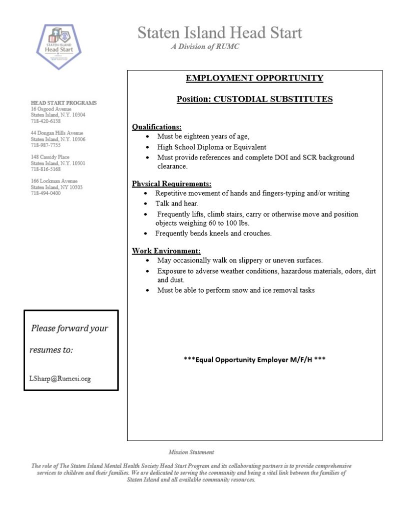 Staten Island Head Start Custodial Substitutes